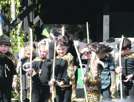 Alle børnene havde selv lavet deres flotte udklædninger, deres smykker, historier og figurer til teaterforestillingen ”Den store Mammutjagt." Samt ikke mindst de flotte dyr, der udgjorde kulisserne.