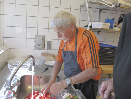 86-årige Poul Erik Jensen i gang ved køkkenvasken. Efter at have været med i madklubben siden 1996 valgte han - med alderens ret - at stoppe i 'Madklub 04' i forbindelse med seneste møde i klubben. Heldigvis har andre interesse at blive medlem så nu er klubben atter fuldtallig med otte medlemmer.