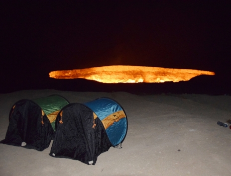 »Det er et sted kaldet "gate to hell", hvor der er et konstant brændende stort hul i jorden. I sin tid havde russerne udvundet gas, men efter en eksplosion blev der stukket ild til gassen, som her 40 år senere stadig brænder,« fortæller Martin om hullet med en dybde på 30 meter og en diameter på cirka 70 meter. Det opstod i 1971 og geologer antændte hullet for at modvirke spredning af den skadelige methangas.