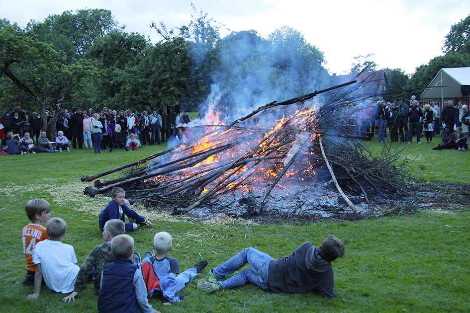 Familievenlig Sankt Hans med ung lokal taler i Skovby. Traditionsrigt bål-arrangement i Storring Præstegårdshave.