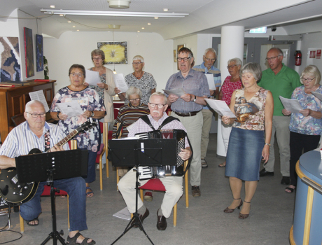 Hver torsdag formiddag genkalder de sangglade medlemmer af »Tjørnebanden« minder for de ældre beboere ved Lokalcenter Tjørnehaven i Galten.