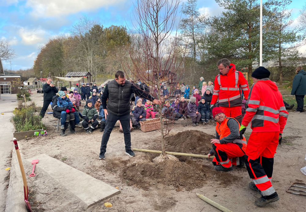 Bygma i Galten har doneret et træ – en sølvpil – der nu knejser på Græshoppens legeplads som en markering af projektets første milepæl.