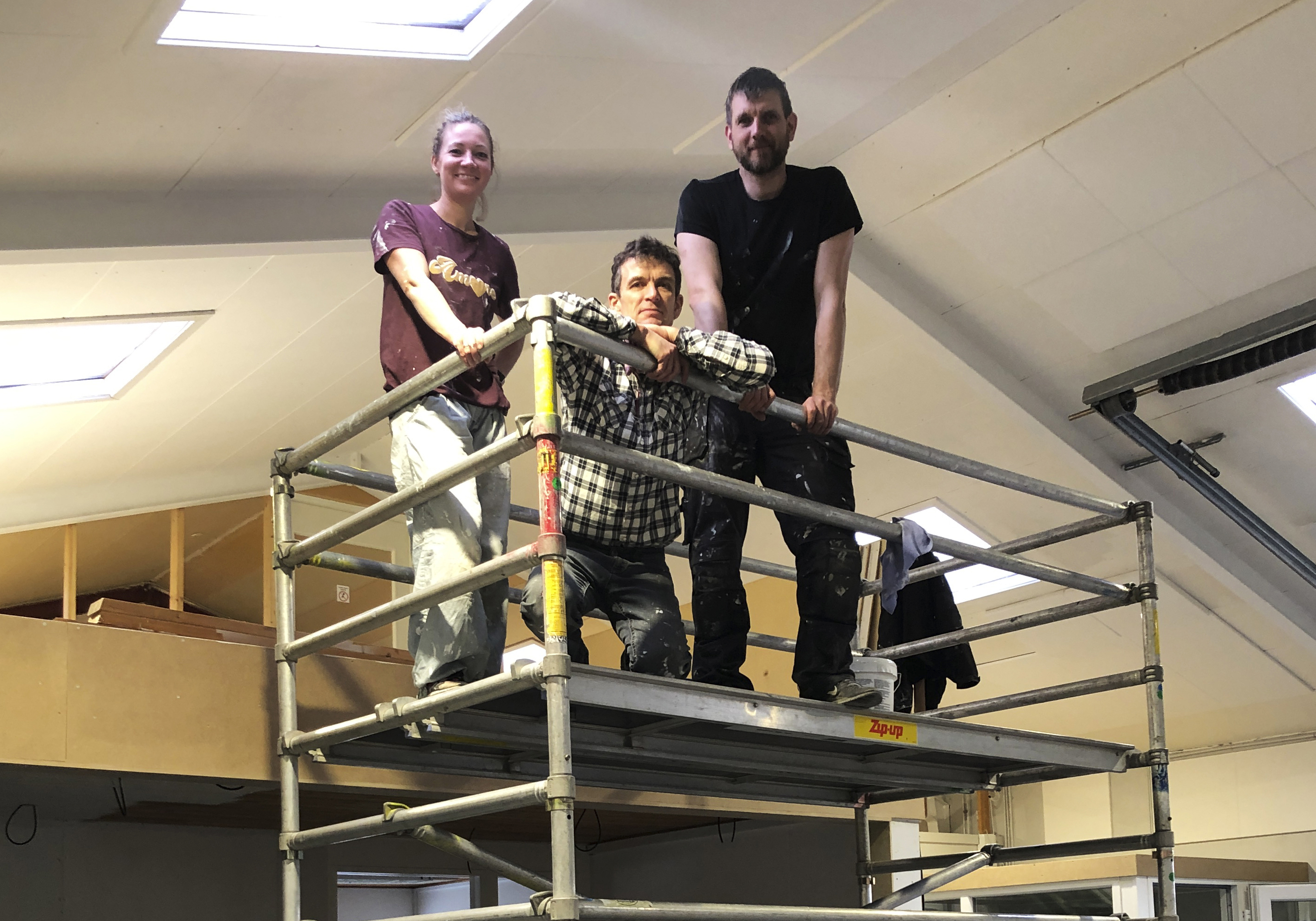 Ejertrekløveret bag Fit&Sund-træningscentret i Skovby, Linda Nygaard, Ole Bonne og Jakob Fryd er i øjeblikket i gang med at klargøre centret til knopskydning med træningsfaciliteter i hallen på også den modsatte side af Hørslevvej.