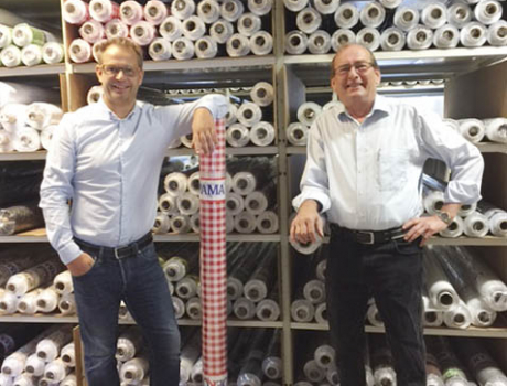 Kim Jakobsen og Kenn Munk, kommende og snart tidligere indehaver af Munke-tex, foran nogle af de 50.000 meter duge som Galten-virksomheden lagerfører.