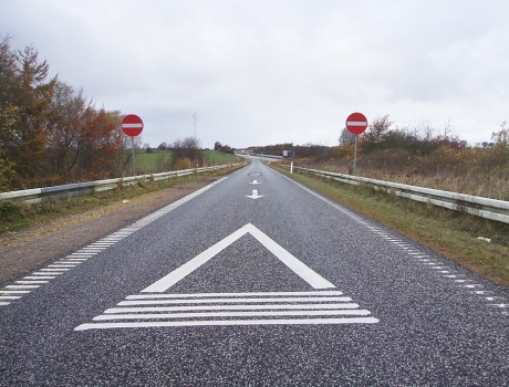 Billedet her er ikke fra Låsby, men viser hvad en spøgelsebillist møder på vejen i den gale retning. Skiltet opleves større jo tættere man kommer på.