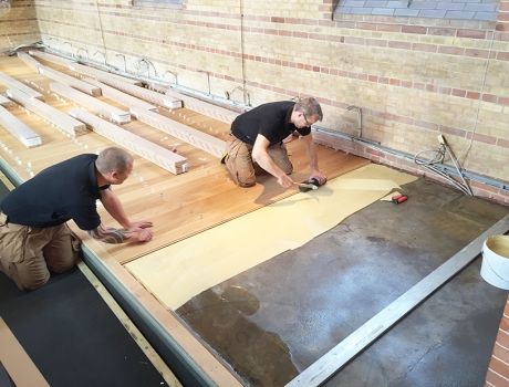 Det gamle nålefilttæppe har aftjent sin værnepligt efter godt 40 år og bliver nu udskiftet med et lysere og flottere egetræsgulv.