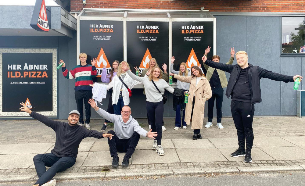 Medarbejderteamet bag Ild Pizzas Galten-afdeling samlet foran Søndergade 26, hvor ovnen tændes onsdag d. 24. juni.