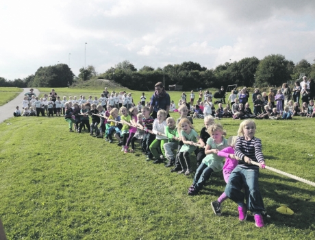 Den traditionsrige disciplin - tovtrækning. Her er det 0.-klasserne på fra Skovbyskolen, der er i fuld gang.