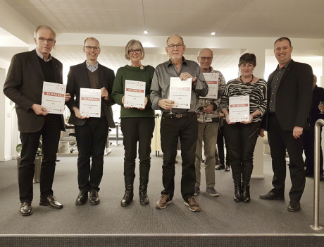 Repræsentanter for Skovby Menighedsråd, Det Selvejende Hus Storring Forsamlingshus, Den Fri Hestehaveskole og Naturbørnehaven Følfod, Skovby Borgerforening, Stjær Senior Petanque Klub og Herskind Forsamlingshus samlet i Jutlander Bank. Yderst til højre ses afdelingsdirektør i Jutlander Bank, Morten Greve.
