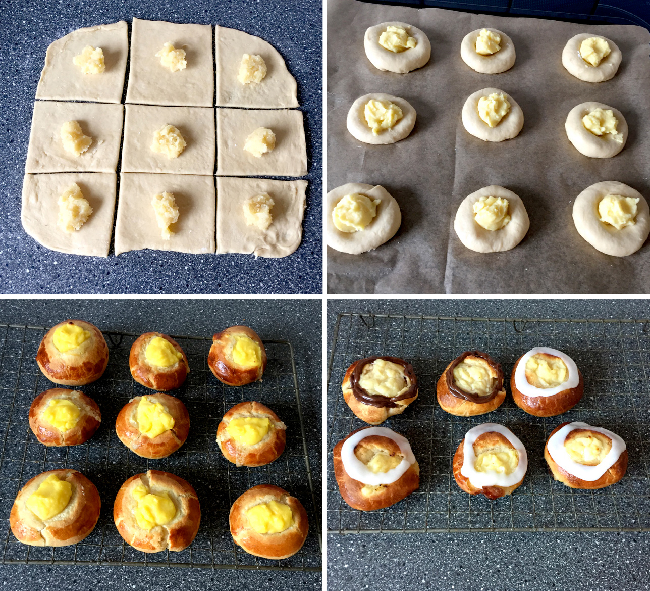 Hviler ca. 5 min. Tryk derefter forsigtigt et hul ned i hver bolle med tommelfingeren, og heri fyldes en ts kagecreme. Hæver ca. 20 min. på et lunt sted. Pensles.