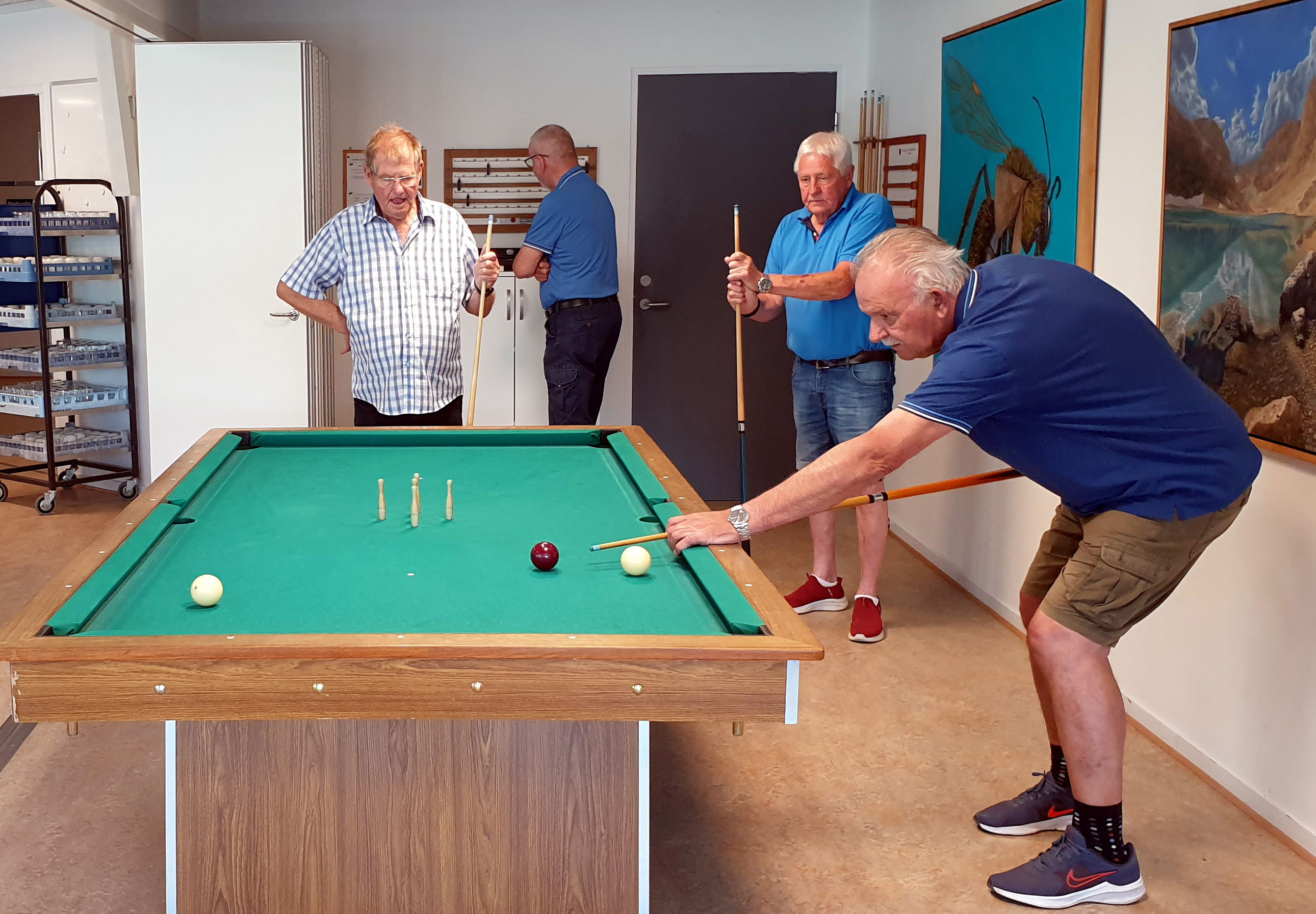 »Måske er det også noget for dig? Vi har hold flere af ugens dage, og vi spiller traditionel Dansk keglebillard, samt ind imellem skomager. Kan du spille lidt i forvejen, er det godt. Kan du ikke, så lærer vi dig det.«
