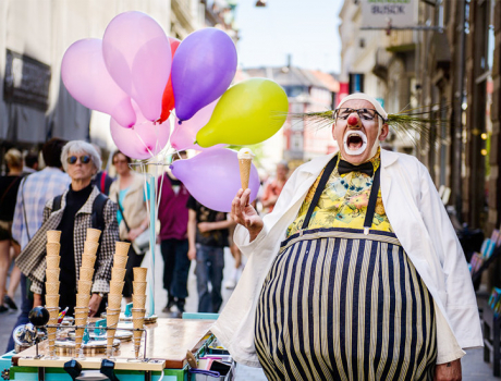 Forestillingen 'Jekyll på glat is' er en visuel komedie med poesi, fysiske gags, enorme balloner og en charmerende is-vogn, hvor klovnen kombinerer sin erfaring fra klovnens univers med interaktivt teater i byrummet.