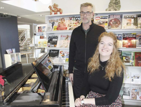 Komponisten af den nye julesang – og lærer ved Stjærskolen – Mads Kjær Madsen sammen med Annika Clemens efter julekoncerten lørdag på Galten Bibliotek. Cirka 60 mennesker var mødt frem til matine-koncerten, der overvejende bød på juleinspireret musik.