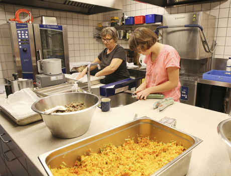 Køkkenleder i børnehaven Nordlyset Githa Staub (tv.) og medhjælper Camilla Thomsen i gang med at forberede frokosten til børnehavens børn. Madordningen er et koncept, der inkluderer sund mad og social indsats