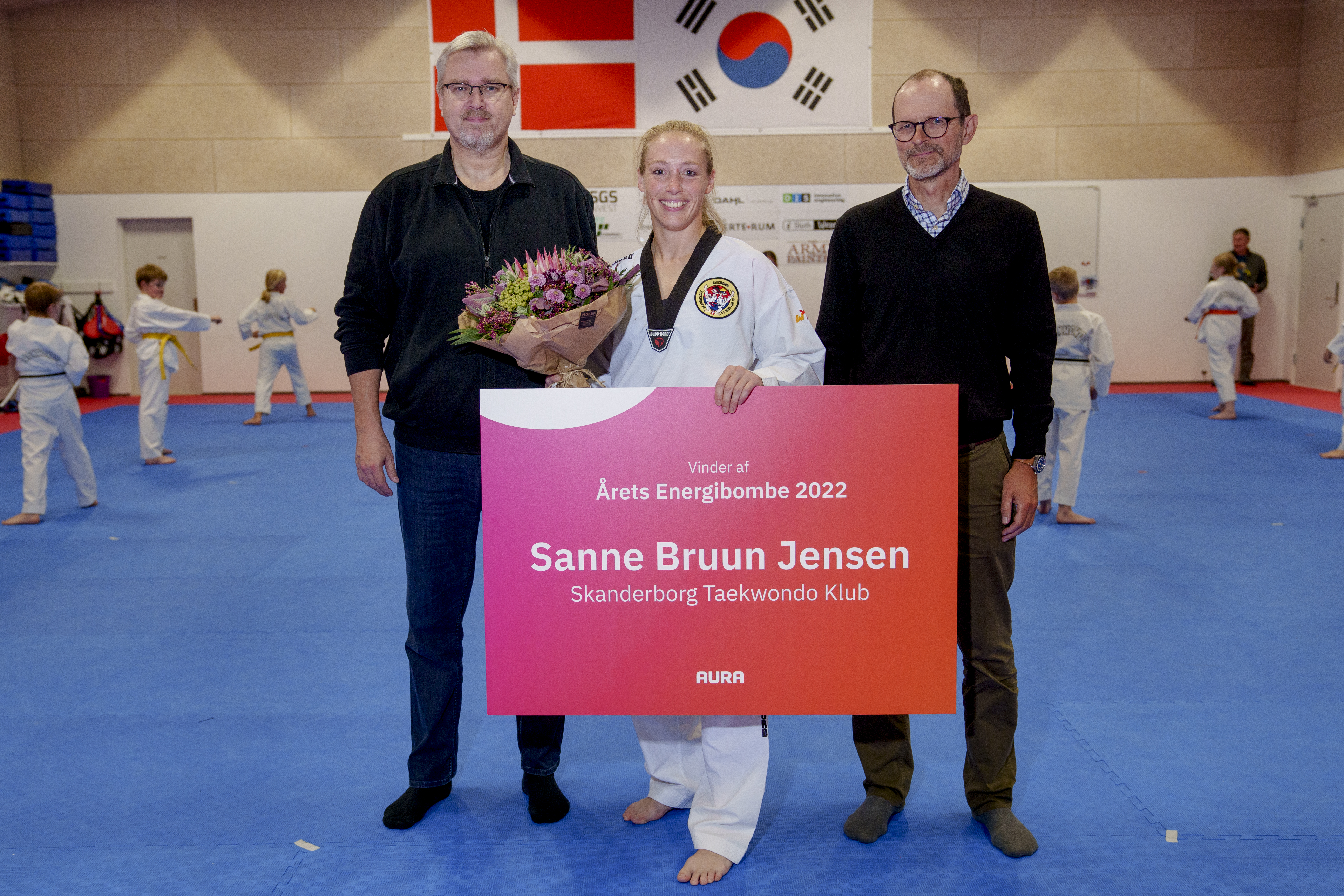 Træningaftenen forleden hos Skanderborg Taekwondo Klubs hold gik ikke helt, som træneren, Sanne Bruun Jensen, havde regnet med, da hun blev overrasket af repræsentanter fra AURA, Skanderborg Taekwondo Klub og sine forældre med budskabet om at hun havde vundet afstemningen, og er Årets Energibombe 2022.