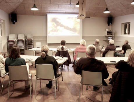 I Skivholme forsamlingshus er der stillet stole frem til små tyve personer. Aftenens arrangement, der er en del af en foredragsrække, 'live streames' fra Aarhus Universitet til forsamlinger i hele landet.