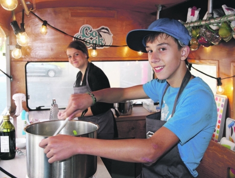 14-årige Christina B. Poulsen og 12-årige Nechlas Højen Møller har travlt ved køkkenbordet i det rullende køkken.