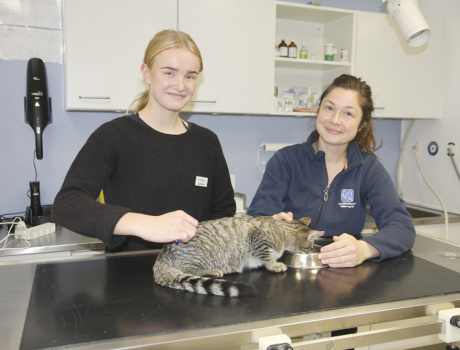 Caroline Kirkegaard Hansen var i praktik hos Galten Dyrlægeklinik og hjælper her veterinærsygeplejerske Christina Pedersen med at undersøge katten Hildegard.