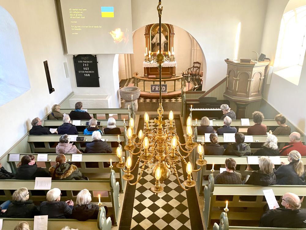 En i forvejen planlagt andagtsgudstjeneste torsdag i Stjær Kirke blev med to dages varsel konverteret til en halv times aftensang- og lystændingsgudstjeneste for Ukraine.