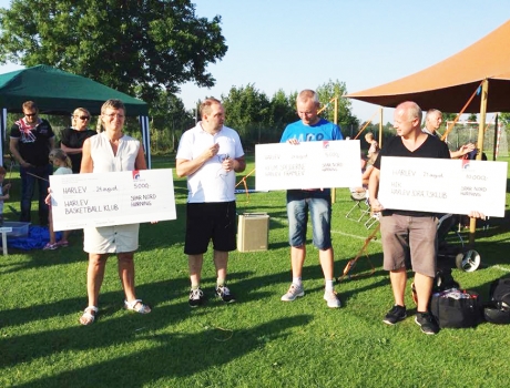 Således overrakte han 10.000 kr. til formand Egon Jørgensen fra HIK, 5000 kr. til formand Tina Jørgensen fra Harlev Basketball Klub samt 5000 kr. til Søren Becher fra KFUM spejderne i Harlev-Framlev.