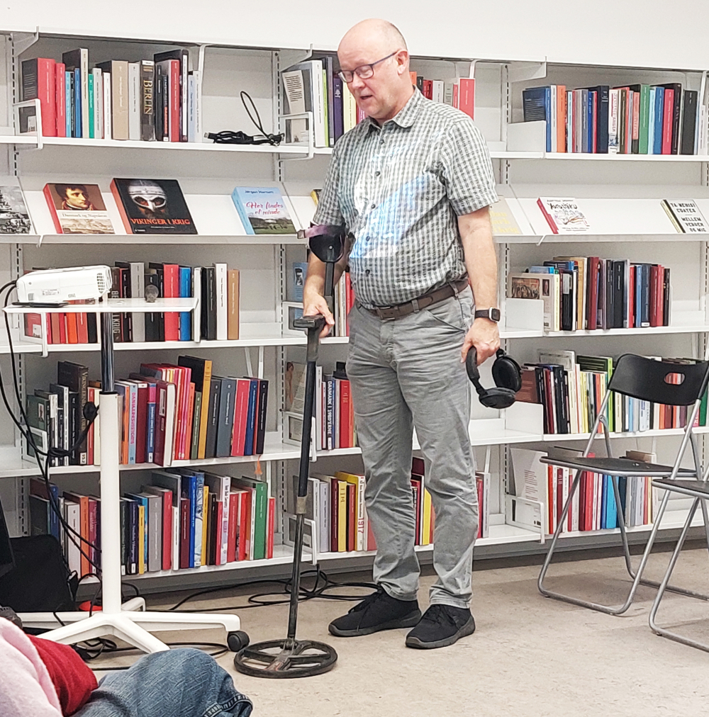 Første punkt på programmet var et foredrag af Allan Faurskov, der har været pioner i Østjylland på brugen af metaldetektor til bl.a. at hjælpe arkæologerne fra Skanderborg Museum med at opspore mønter og andre genstande fra middelalderen, vikingetiden og tidligere.