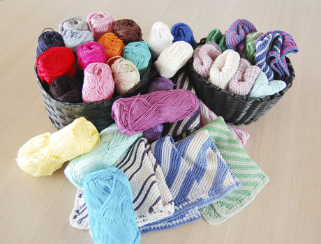 »Disse frigives ved brug og i vask og ender i havene, i fisk og endeligt i os selv. Og plastik er som bekendt ikke sunde i levende organismer,« siger menighedsrådsmedlem Kirsten Koldste og baggrunden for, at man, i stedet for at købe bomuldskarklude, finder det meget hyggeligere med farvestrålende hjemmestrikkede karklude, som mange forskellige har nørklet.