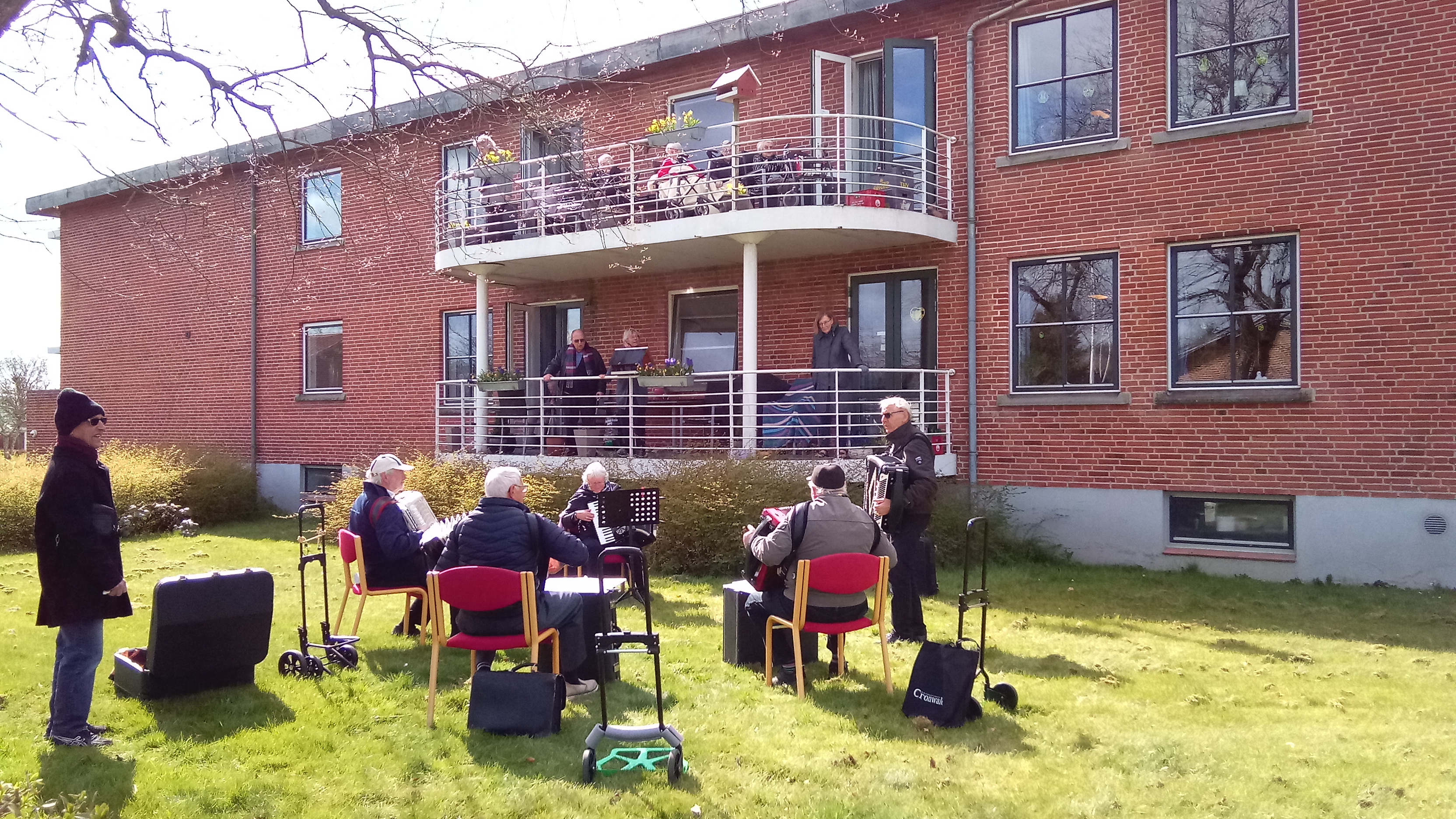 Fem harmonika-musikanter tog 2. påskedag plads i haven ved Lokalcenter Tjørnehaven for at underholde de ældre.
