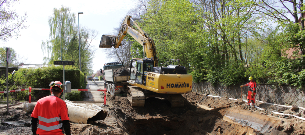 »Normalt kan vi pumpe vand udenom vores udgravninger, men hverken pumperne eller de rør, der i forvejen lå i området, kunne følge med i vinter. Så vi har virkelig været udfordret af regnen og har ikke kunnet holde det tempo, vi normalt kan på vores anlægsprojekter,« siger projektleder Torsten Schriver Niewald om hvordan den ekstreme situation har påvirket arbejdet.