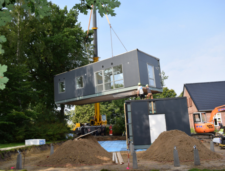 I tirsdags blev Porskjær Børnehaves nye vuggestue-afsnit løftet på plads i haven ved Porskjær.