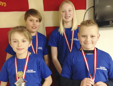 Galten tog førstepladsen i holdturneringen for BK3-4 hold. De stolte skytter på billedet er øverst fra venstre: Lasse Koehler Overgaard og Emilie Jørgensen. Nederst fra venstre ses: Patrick Alexander og Milo Bøg Andersen.