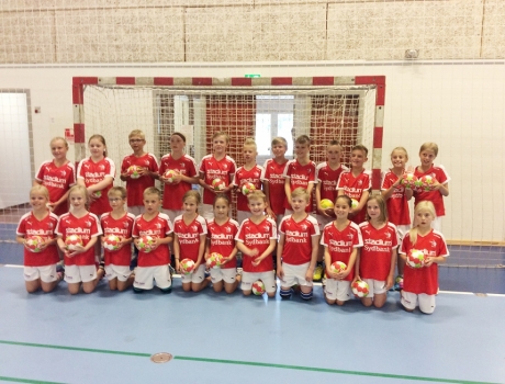 Et "holdfoto" af U10-spillerne ved Stjær Boldklubs håndboldskole i sidste uge.